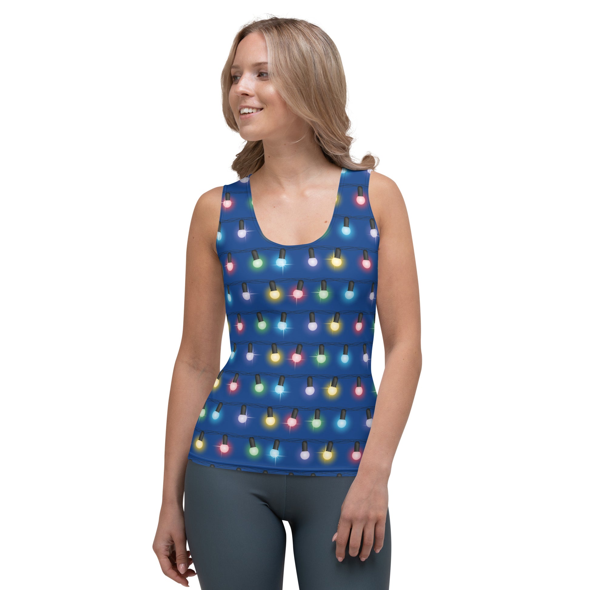 This versatile collection is available in leggings, capris, sports bras, and tank tops, all featuring the same captivating design as well as a solid option for both tops matching the design's background. The deep blue hue creates a sense of calm, while the festive Christmas lights add a touch of holiday magic to your entire ensemble.